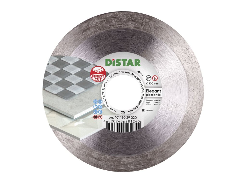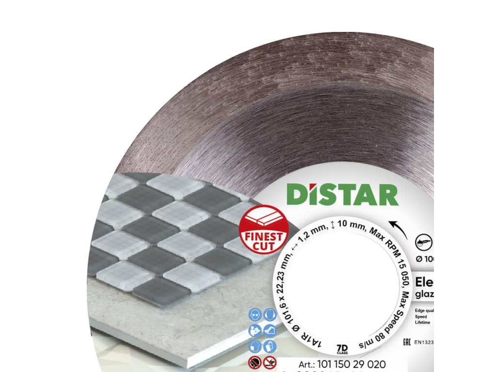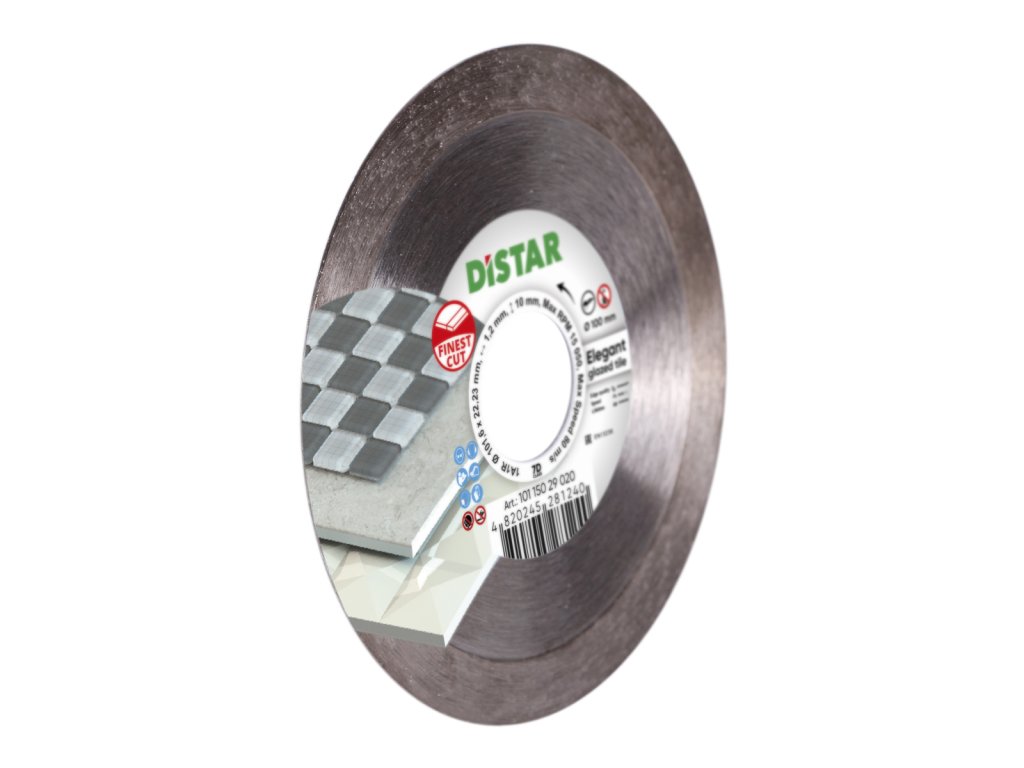 Diamantový kotúč DISTAR 100 ELEGANT je ideálny na dokončovacie rezanie aj zložitých dlaždíc a materiálov (napr. glazované dlaždice, mozaiky). Kotúč má priemer len 100 mm, vďaka čomu je veľmi presný a má minimálne vibrácie. Má najvyššiu kvalitu rezu z diamantových kotúčov DISTAR. Je vhodný aj na rezanie glazovaných dlaždíc bez vzniku úlomkov. Kotúč je určený pre uhlové brúsky, pre rezanie na sucho pod uhlom 90°.