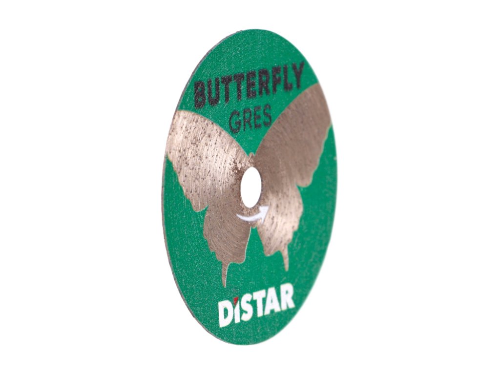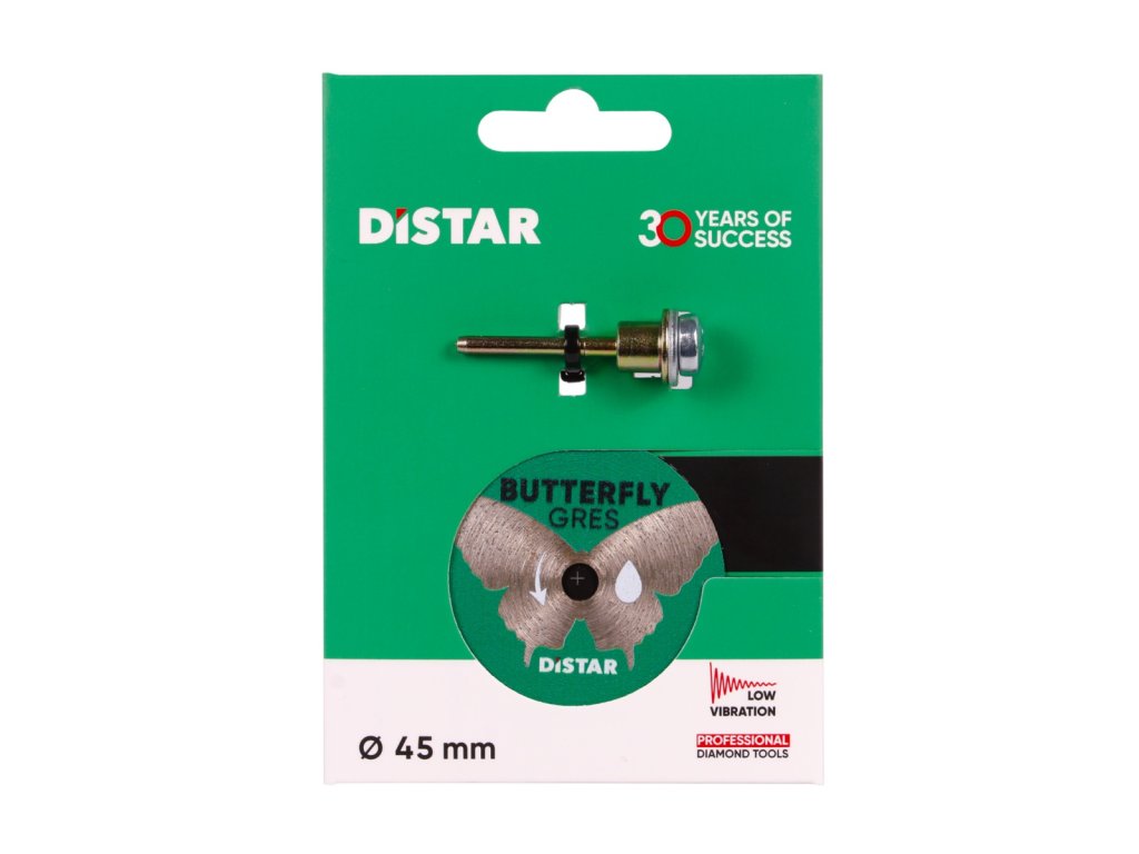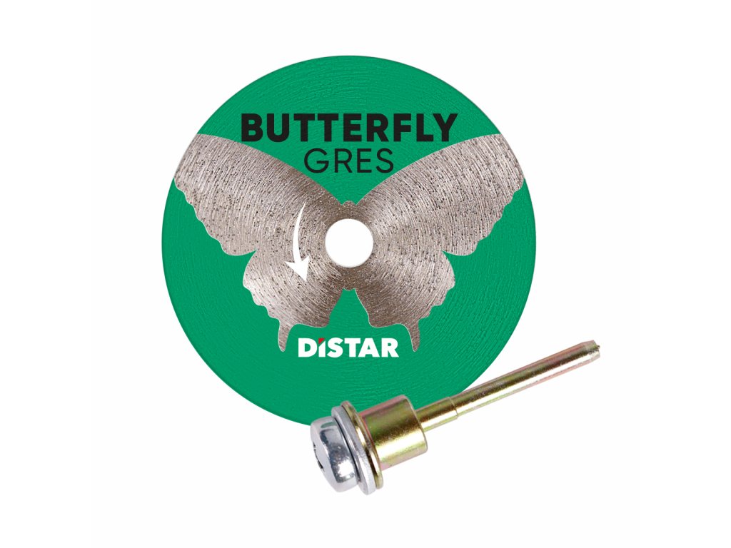 Malý kotúč pre veľké výsledky! DISTAR BUTTERFLY (motýľ) je špeciálny diamantový rezný kotúč určený na veľmi presné a detailné rezanie a vyrezávanie dlaždíc z (porcelánového) gresu a keramiky. Má priemer len 45 mm! Je špeciálne vhodný na detailné vyrezávanie dlaždíc, dokončovacie rezacie práce, vyrezávanie dekoratívnych prvkov, otvorov, častí nábytku, krytov a pod.. S týmto kotúčom sa dostanete aj na neprístupné miesta pre bežné diamantové kotúče (s Ø 115 a viac mm). Čepeľ má celistvý diamantový segment s hrúbkou len 0,6 mm, ktorý zaručuje jeho vysokú presnosť a čistý rez. Je určený pre elektrické mikronáradie, pre elektrické vŕtačky a brúsky s chladením vodou. Súčasťou balenia je upínací hriadeľ.