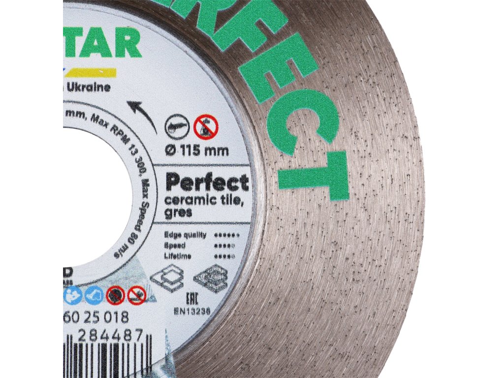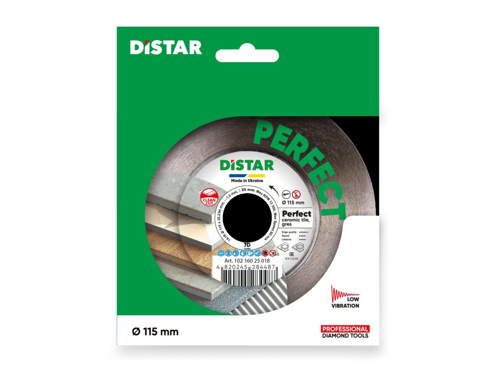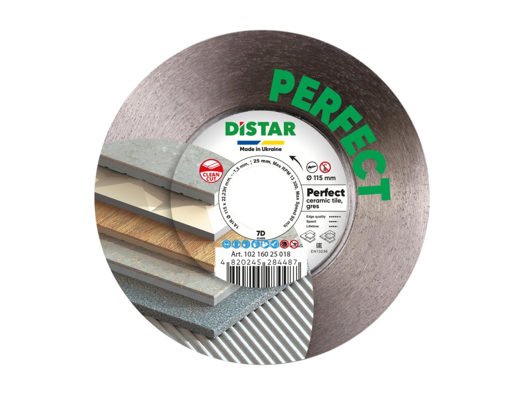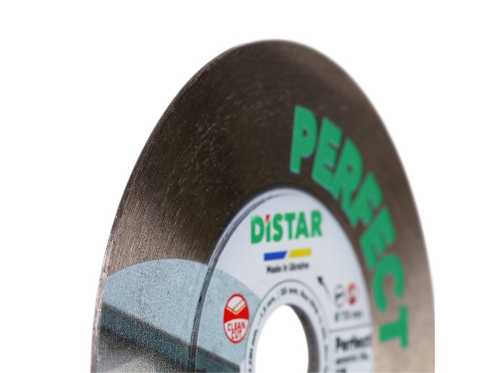 Diamantový kotúč DISTAR 125 PERFECT je určený na priame rezanie dlaždíc hlavne z keramiky a porcelánového gresu. Je výnimočný svojim veľmi čistým a kvalitným rezom, pričom si stále zachováva vysokú odolnosť a životnosť. Poskytuje rovnako vysokú kvalitu rezu ako kotúč ESTHETE 2.0, ale má vyššiu životnosť. Jeho vylepšené vlastnosti sú dosiahnuté sendvičovou konštrukciou segmentu s hrubšou vrstvou diamantov a dodatočnou prírubou kotúča. Vonkajší priemer kotúča je 125 mm. Vnútorný priemer je 22,23 mm. Kotúč je určený pre uhlové brúsky, pre rezanie na sucho pod uhlom 90°.