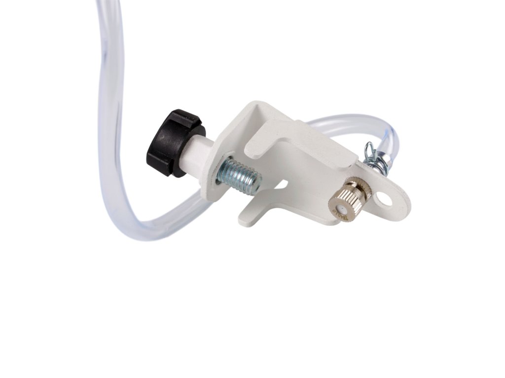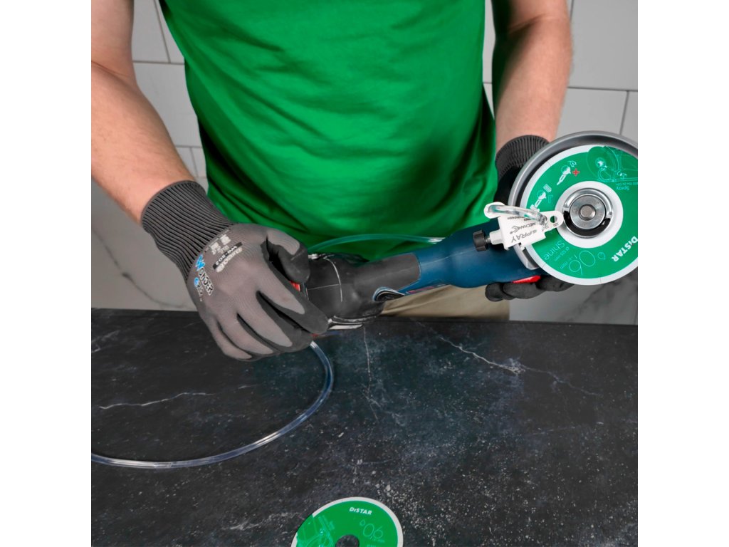 Nástavec na uhlovú brúsku Spray 115-125 tieto problémy rieši. Univerzálny držiak umožňuje upevnenie na ochranný kryt uhlovej brúsky akejkoľvek značky a modelu. Tým sa uvoľní jedna ruka, čo je veľmi praktické. Tryska dodáva minimálne množstvo vody – práve toľko, koľko je potrebné na účinné chladenie – a pritom nevytvára zbytočný neporiadok.