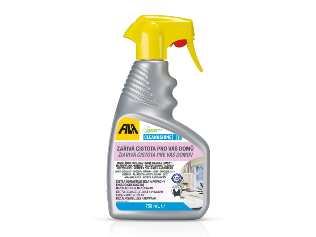 Fila Clean & Shine od talianskeho výrobcu FILA Solutions je praktický čistiaci sprej vhodný na každodenné použitie na rôznych typoch povrchov. Produkt je určený pre rýchle čistenie keramických dlažieb, porcelánu, laminátov, skla, nerezu, dreva aj plastov, pričom nezanecháva šmuhy ani povrchovú vrstvu. Vďaka svojmu zloženiu bez alkoholu a amoniaku je šetrný k materiálom aj k prostrediu.